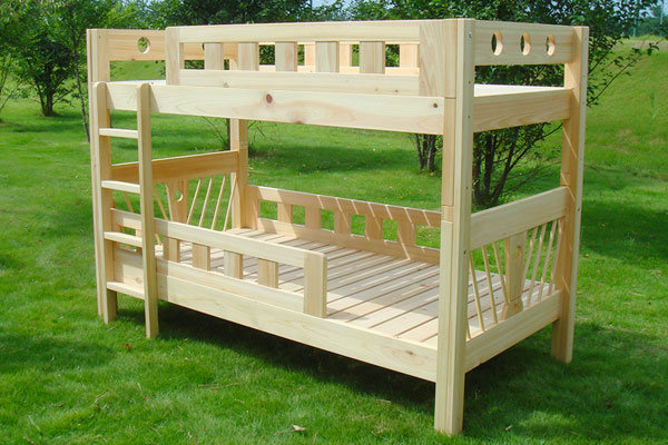 上段と下段でフットボードのデザインが異なる二段ベッド。上段のフットボードは円形のくり抜きデザインで、下段のフットボードは細身の桟を斜めに設置したデザインに仕上げました。