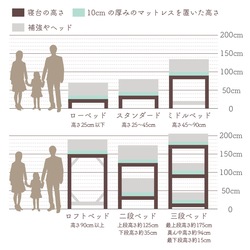 ヒノキ・ワークスでは、寝台高さ25cm以下をローベッド、25〜45cmをスタンダード、45cm〜90cmをミドルベッド、90cm以上をロフトベッドとしています。