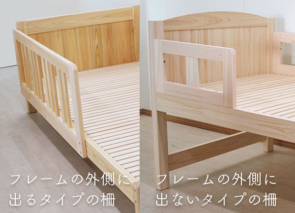 柵の造りによっては、ベッドフレームの外側に出っ張るタイプとベッドフレーム内に収まるものに分かれます。